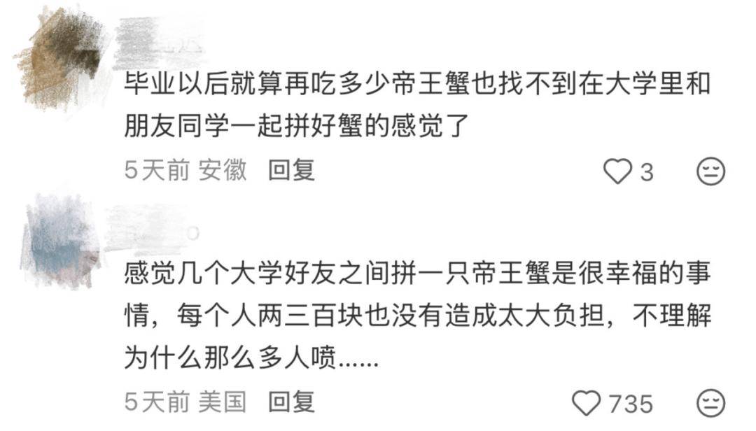 说来也巧,确实有学生打趣般地写下了“帝王蟹”——虽然后来食堂暗示上架帝王蟹和那则留言没有什么间接关系,但至多某种程度也申明,学生不是从食堂起头供应帝王蟹才起头逃求甘旨的。这些新餐食的存正在,并没有挤占掉平价食堂菜的存正在空间,只是学校给学生供给的用餐新选择之一。